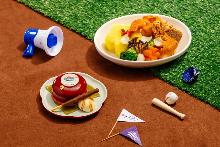 機上餐點的規劃也別出心裁,備有兩款主菜選擇,「勝宴海味珍饗」以扁鱈搭配明蝦,提供優質蛋白質為選手補充體力;「勝利茄汁焗豬排飯」則運用日文「勝利」的諧音,為中華隊加油打氣。甜點以 Team Taiwan 為靈感,加上棒球意象設計,呼應棒球經典賽主題。此外,機上也備足冠軍奶油麵包與紅豆麵包,全方位照顧團隊在飛行中的能量補給,迎戰世界級勁敵。