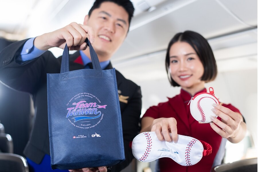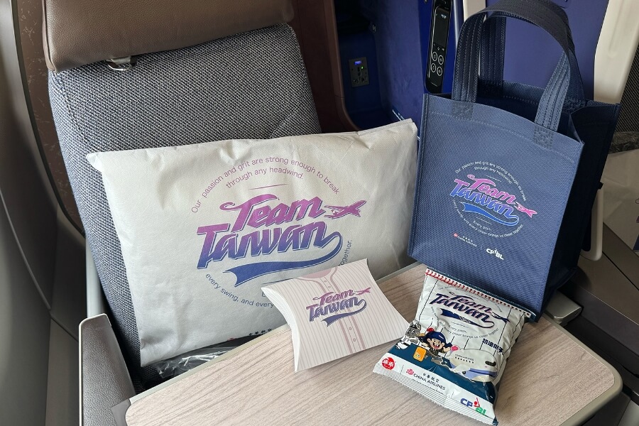 華航特別為包機換上專屬服務用品,在機艙內點綴棒球元素,包含 Team Taiwan 枕套、飲料紙杯及果豆點心,讓台灣英雄上機即被滿滿加油氛圍環繞。華航也準備專屬紀念品致贈球員,包含棒球造型眼罩、棒球造型零錢包、主題乖乖、精緻旅行包組等,讓選手們在旅程的起點就能感受到支持的力量。